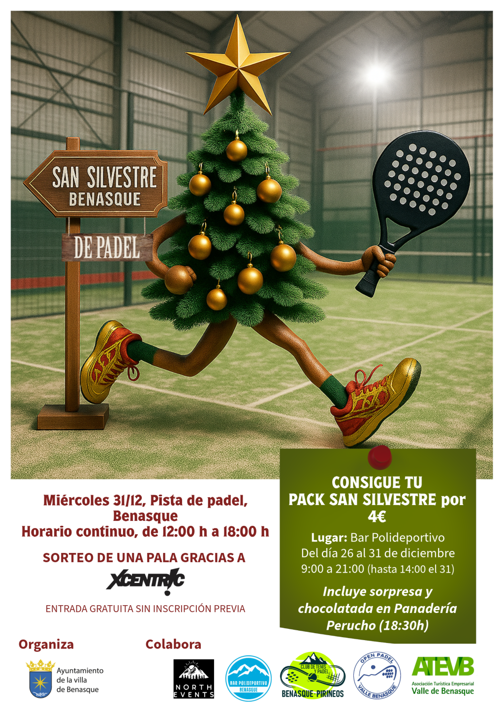 ¡Pero eso no es todo! Participa en el SORTEO DE UNA PALA cortesía de XCENTRIC y asegura tu PACK SAN SILVESTRE por solo 4€ que incluye una sorpresa y una riquísima chocolatada en Panadería Perucho (a las 18:30h).